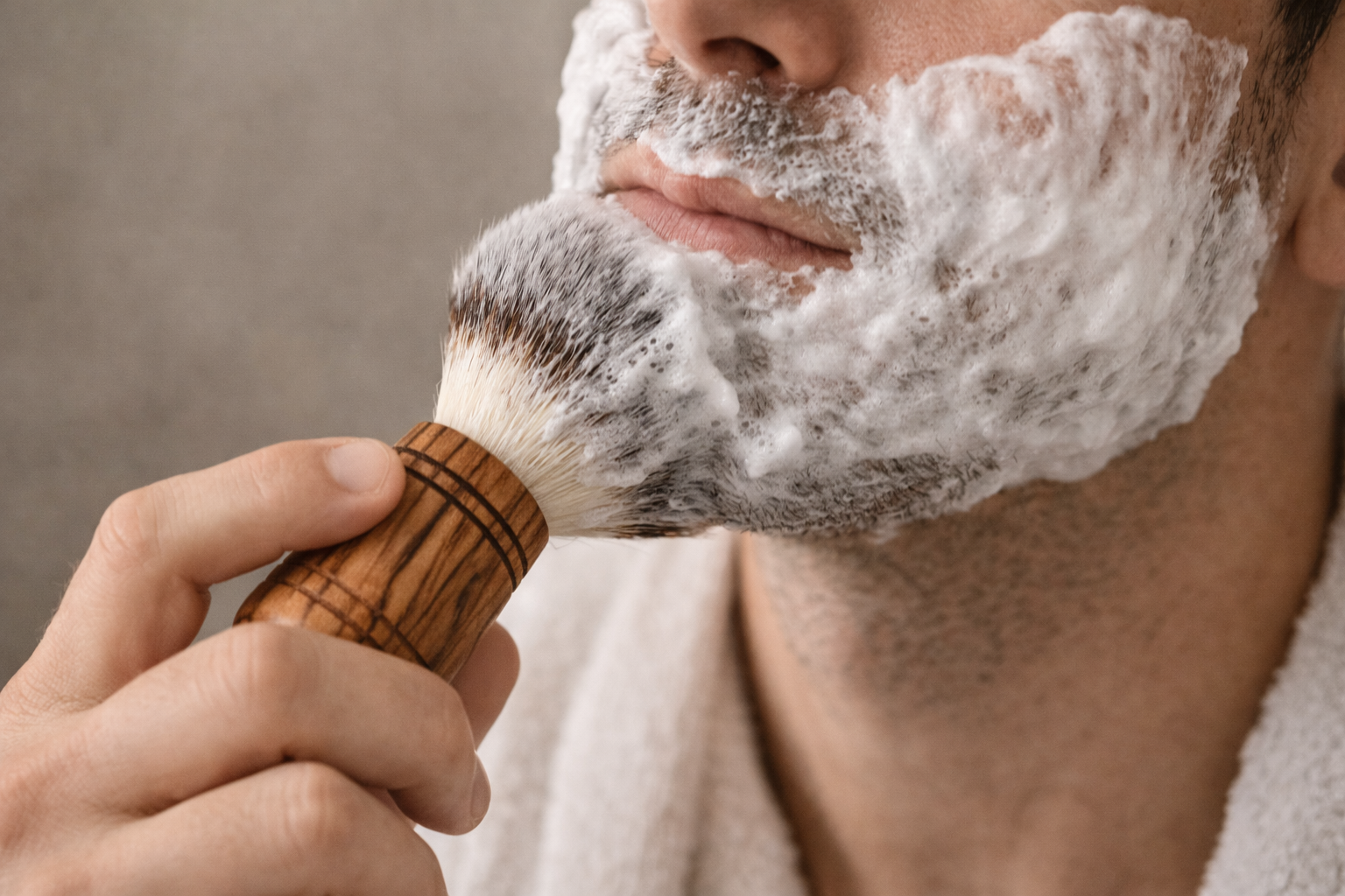 Dieser vegane Rasierpinsel aus Olivenholz steht für klassische Nassrasur in ihrer reinsten Form.